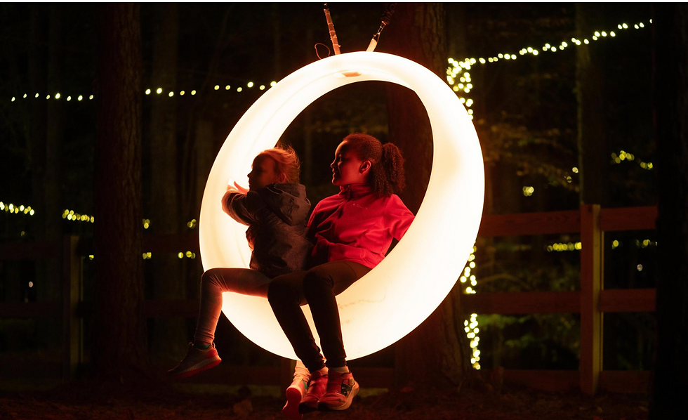 As part of Winter at Whitewater, the Winter Canyon Trail offers an illuminated walking adventure through the woods at night. With suspension bridges, play structures, and unique discoveries for all ages, this free activity is perfect for families.